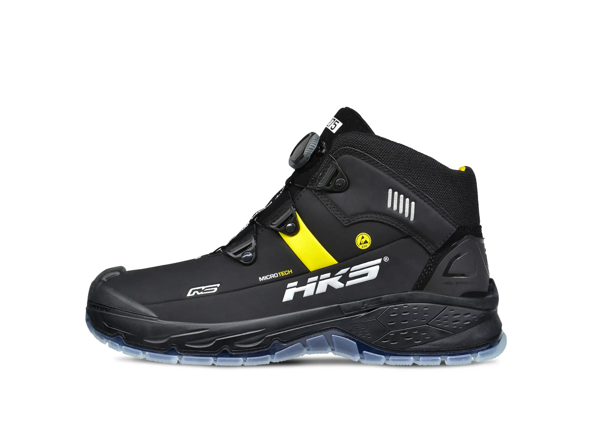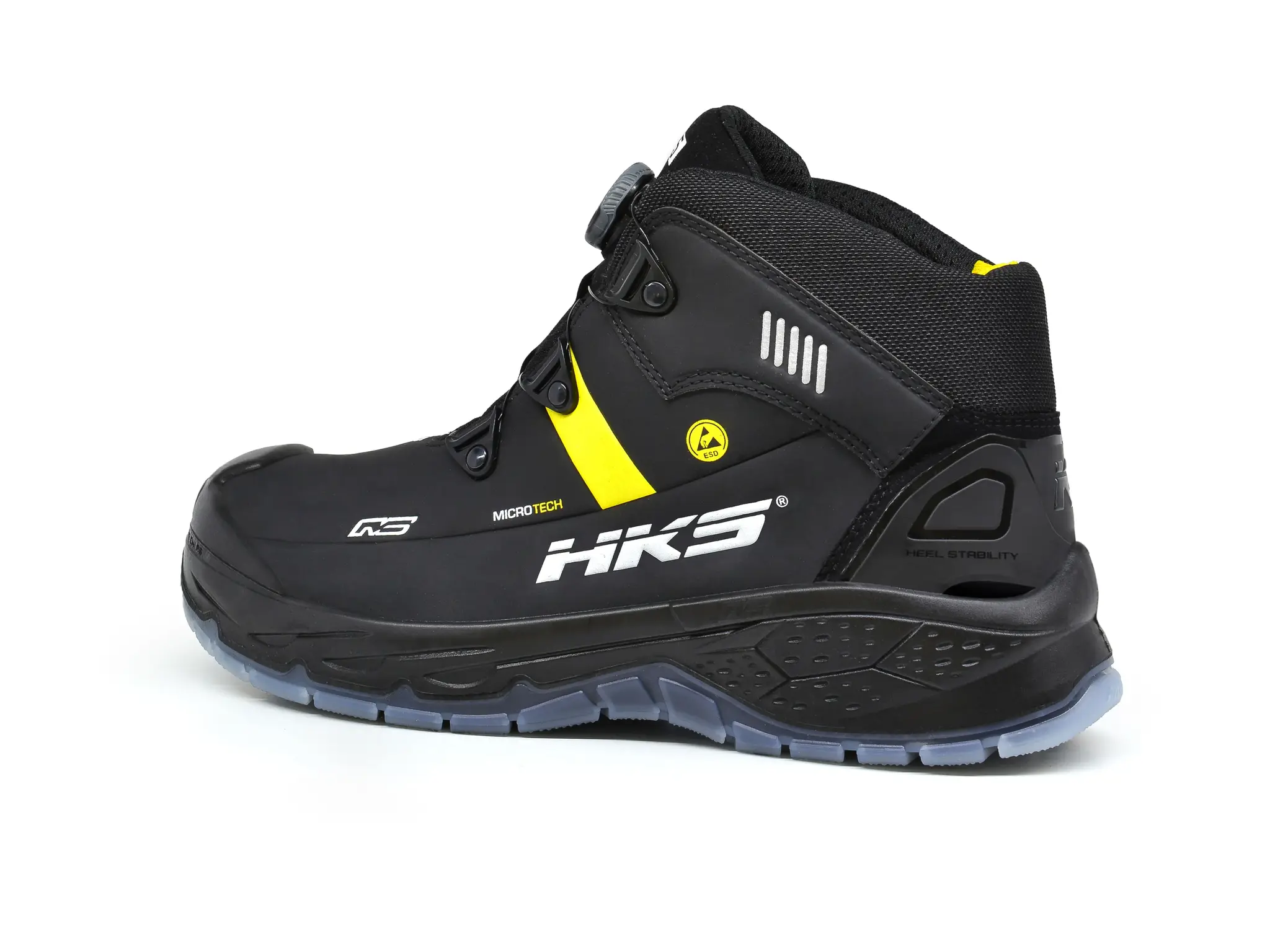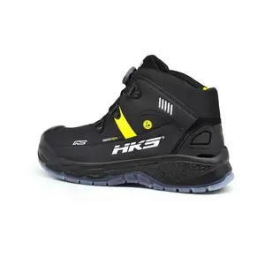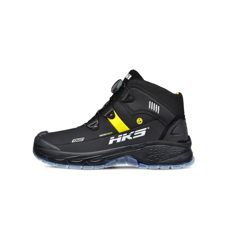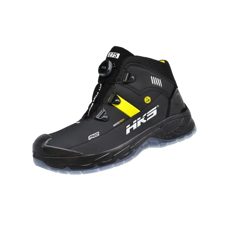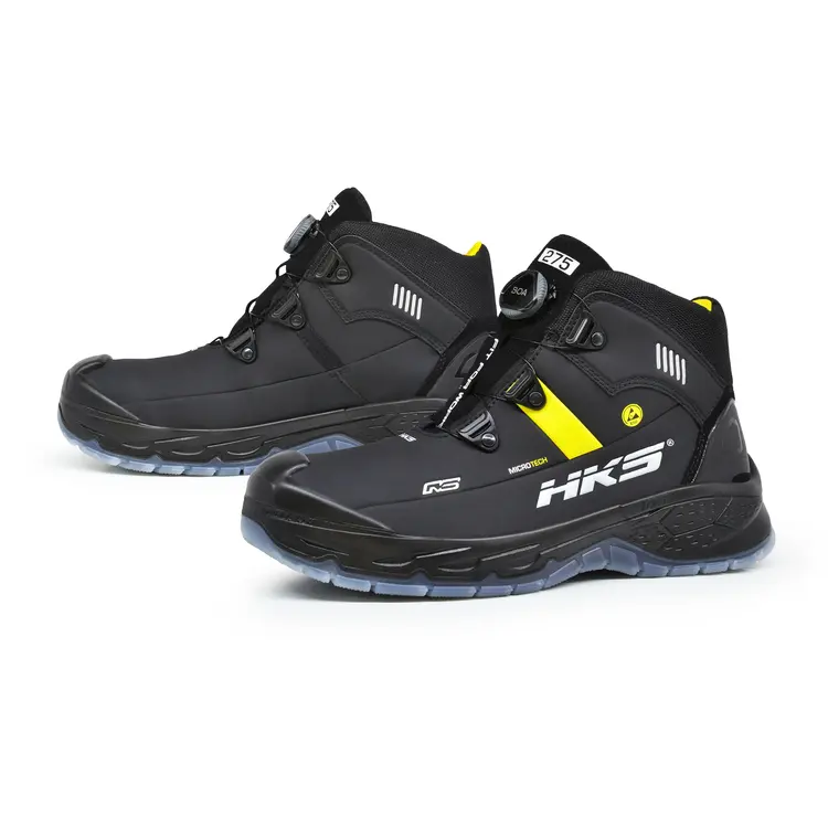 De HKS RS 275 is een heren werkschoen in een hoge uitvoering. De HKS RS 275 BOA voldoet aan de S3 veiligheidsklasse en is voorzien van een stalen neus en flexibele antiperforatie tussenzool. Het bovendeel is zwart met geel van kleur en gemaakt van Hydrofoob Microtech. Dit materiaal is slijtvast, waterbestendig, duurzaam en er zijn geen dierlijke materialen in verwerkt. Dit maakt de HKS RS 275 BOA tot vegan werkschoenen. Het geeft ze tevens een sportieve uitstraling.