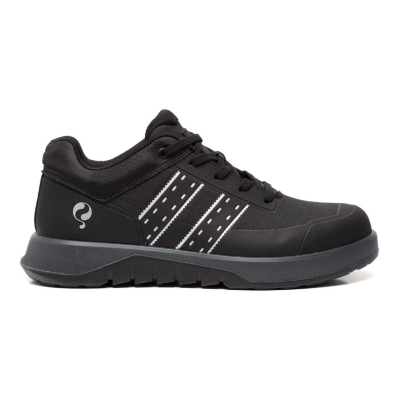 De Quick Urban QS0202 S3S zwart is een volledig vegan werkschoen, gemaakt zonder dierlijke materialen. Het bovenwerk bestaat uit geweven microfiber gecombineerd met lycra en TPU, wat zorgt voor een flexibele en sterke constructie. Aan de binnenzijde is de werkschoen voor heren voorzien van een ademende 3D-mesh voering en een inlegzool van memory foam voor optimale demping en ventilatie. Een slim detail is de vastgestikte tong, die voorkomt dat vuil, zand en stof de werkschoen binnendringen.